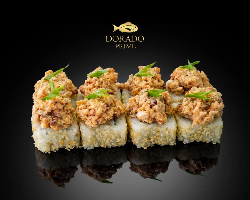 Внутри скрывается дуэт из нежной креметты и свежего огурца. Сверху ролл увенчан тартаром из угря, заправленным пикантным спайси-соусом. Перья зеленого лука служат свежим акцентом и завершающим штрихом