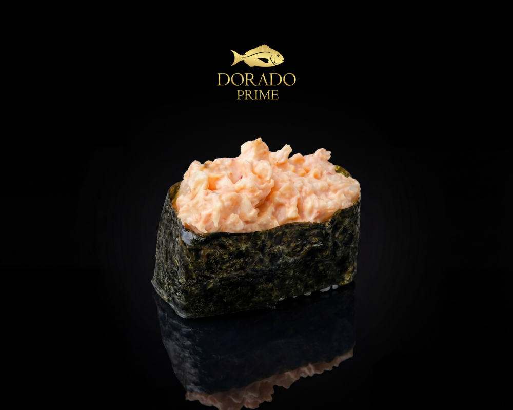 Нежнейший, мелко рубленный тар-тар из гребешка который идеально подчеркивается и раскрывается благодаря соусу спайси