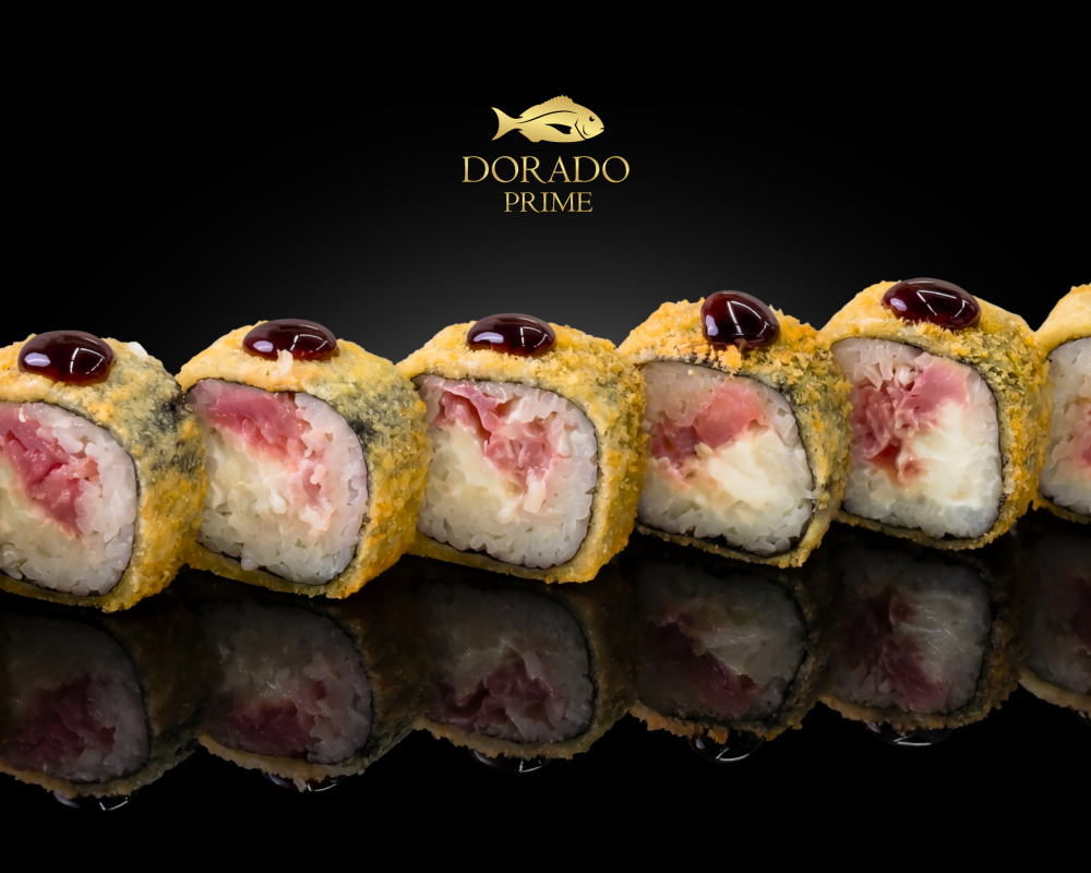 Внутри сочетание нежной креметты и свежего тунца. В завершении украшается капелькой соуса унаги