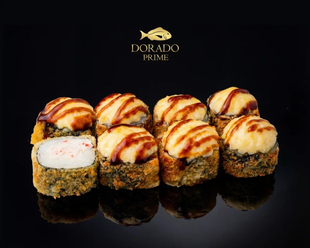 Роскошный горячий ролл с крабом и креметтой, обжарен во фритюре и запечен под сырной шапкой, завершенный унаги соусом.