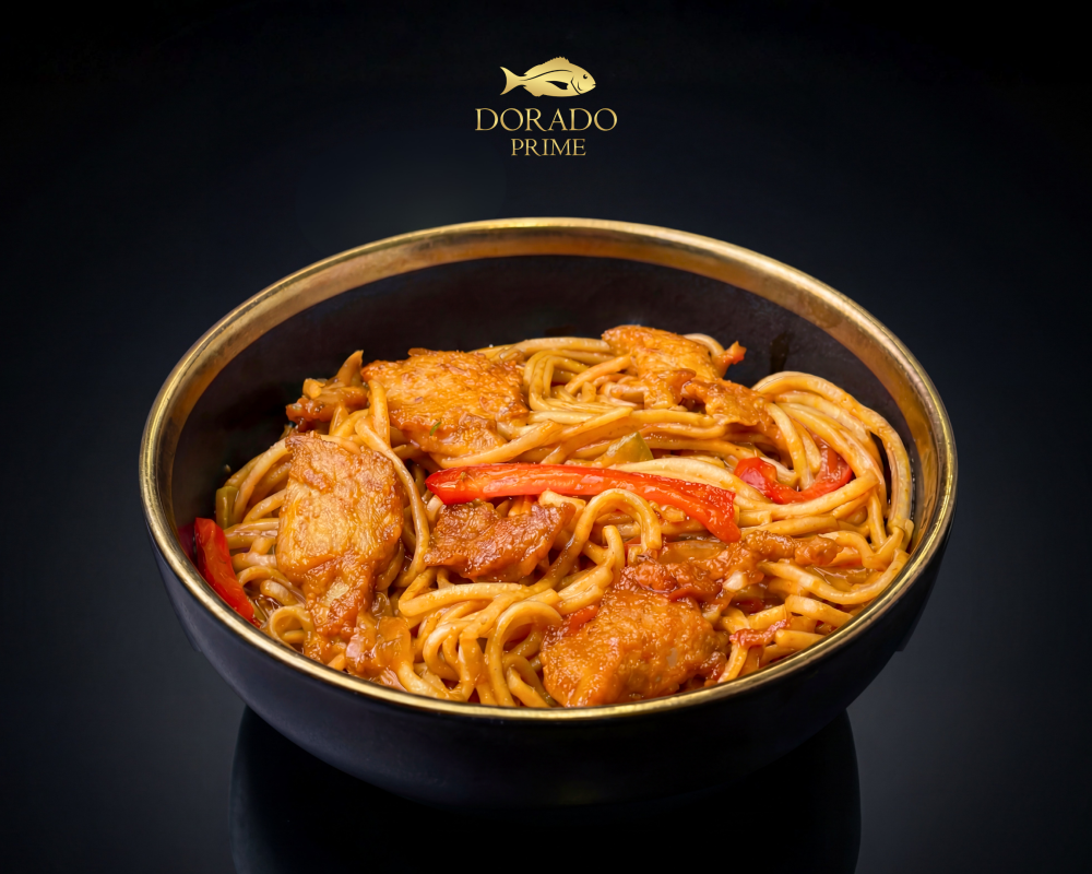 Нежная лапша удон в дуэте с сочным куриным филе и миксом овощей: моркови, цукини, болгарского перца и лука под соусом спайси