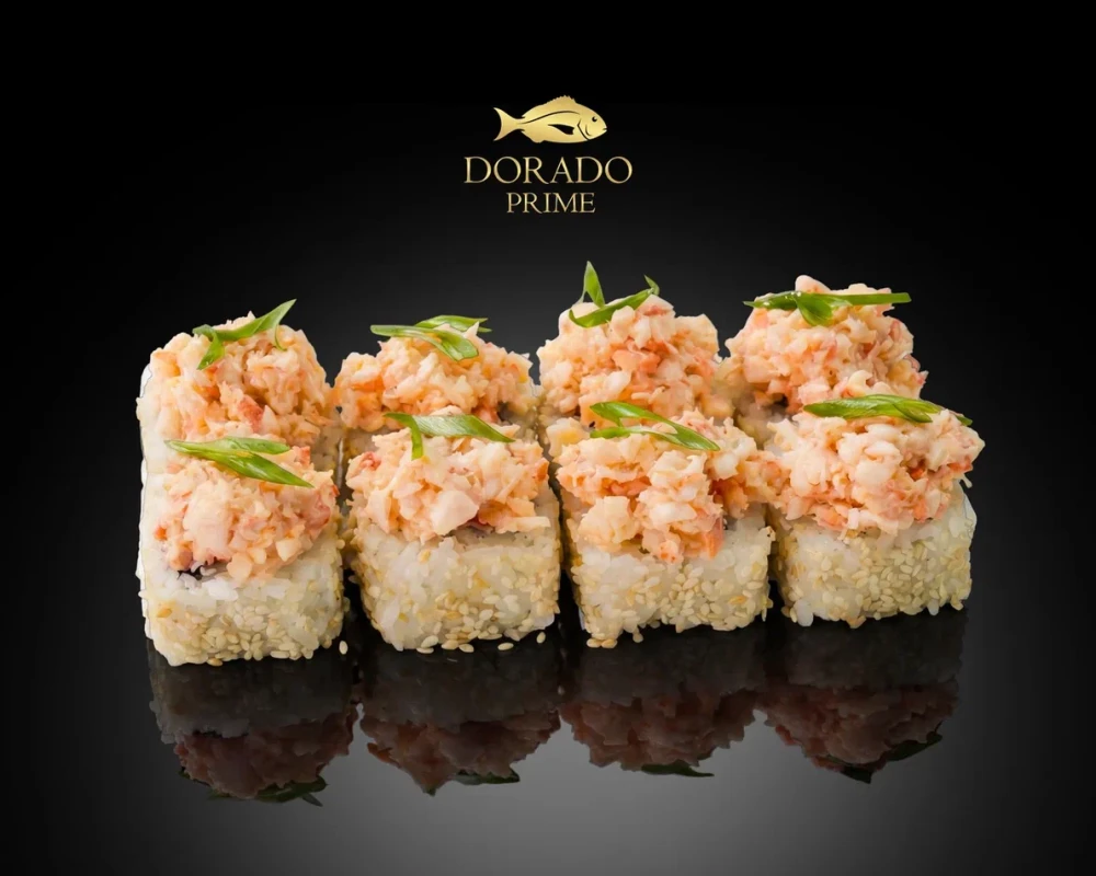 Внутри скрывается дуэт из нежной креметты и свежего огурца. Сверху ролл увенчан тартаром из креветки, заправленным пикантным спайси-соусом. Перья зеленого лука служат свежим акцентом и завершающим штрихом