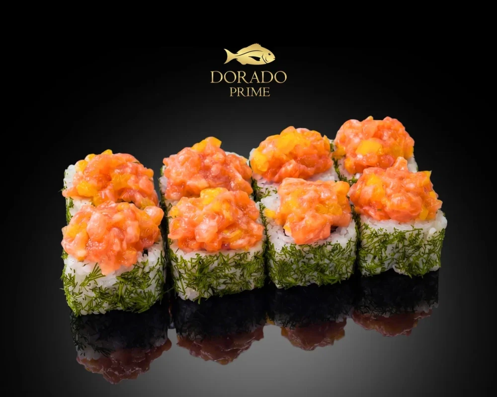 Креметта и хрустящий огурец, завернутые внутрь, создают мягкую основу, а обсыпка из ароматного укропа придает ему свежий вид. Венчает композицию тартар из лосося и консервированного манго