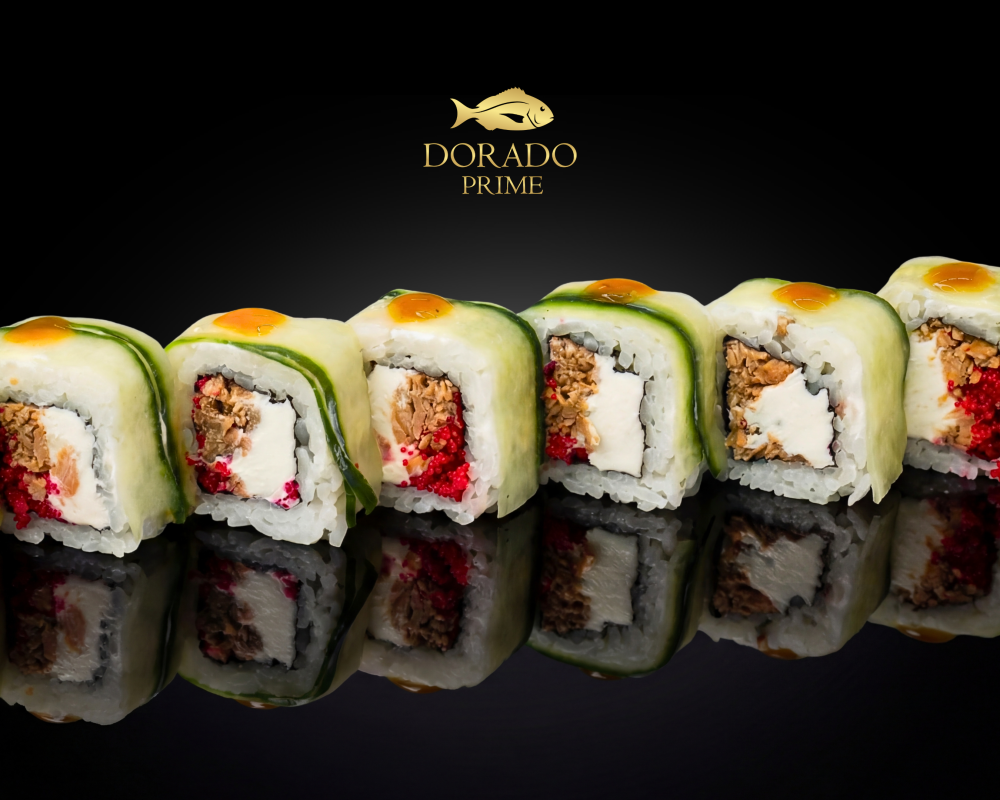 Нежнейший сливочный сыр с добавлением красной масаги, которых обволакивает лосось, обжаренный в соусе терияки. Снаружи ролл укрыт тонкими слайсами огурца и золотистая капля соуса манго-чили