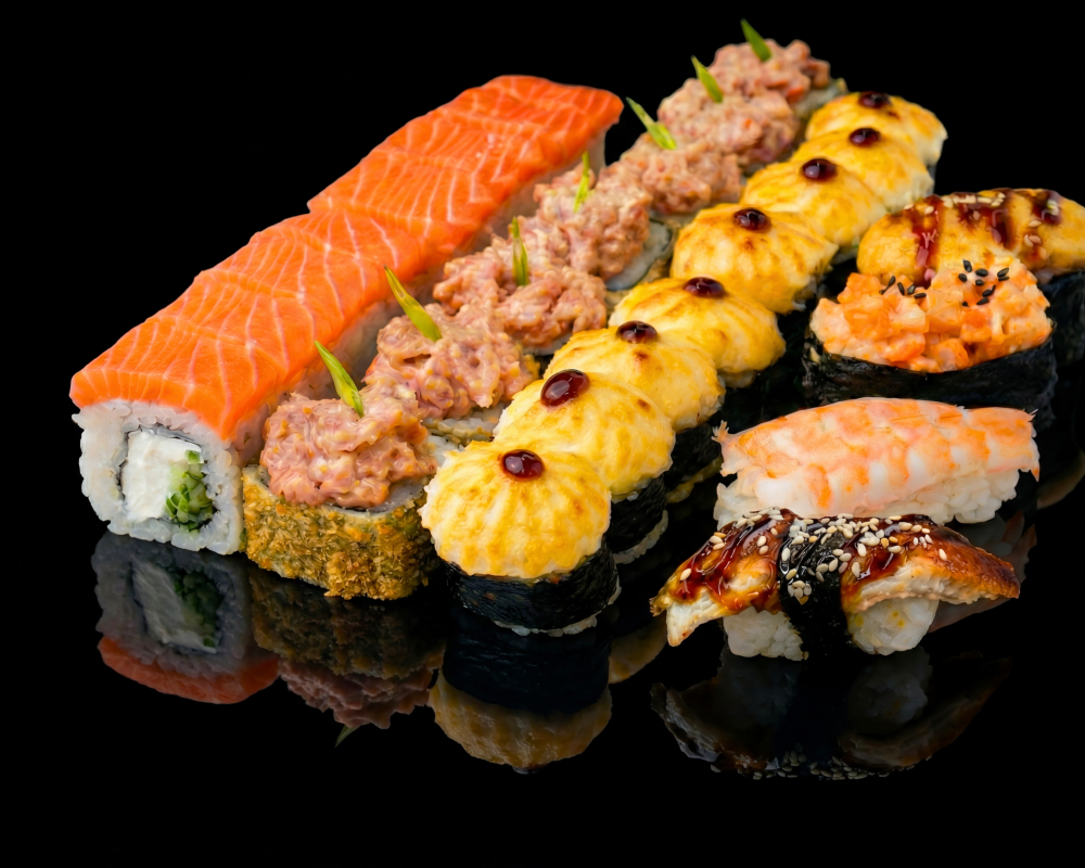 Филадельфия лайт, темпура тунец спайси, запеченный с крабом, гункан креветка спайси, запеченный гункан с гребешком, суши эби, суши унаги
