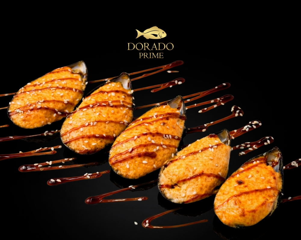 Крупные мидии в створках под огненной шапкой соуса спайси