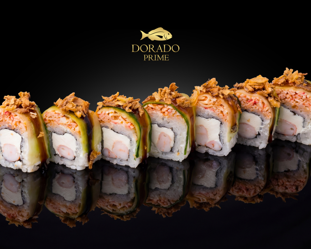 В основе дуэт сливочного сыра и креветки. Сверху выложена начинка из снежного краба в соусе кимчи. Завершает слайс огурца, соус унаги и лук фри