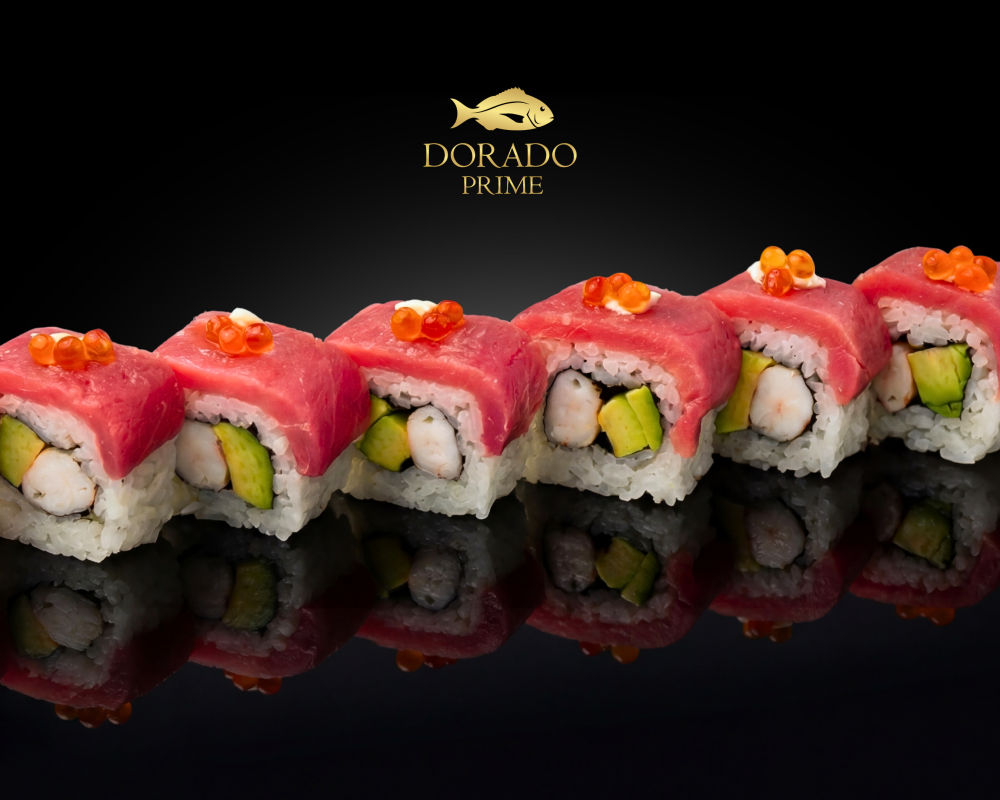 Нежная креветка идеально сочетается с авокадо. Ролл покрыт слайсами тунца, которого дополняет капелька сливочного сыра в дуэте с красной икрой