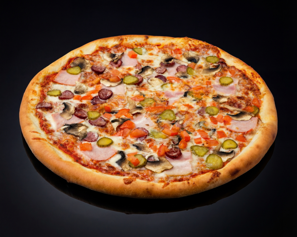 Аппетитная и сытная пицца с ярким вкусом, сочетающим нежный бекон, пикантные охотничьи колбаски, спелые томаты, сочные корнишоны, ароматные грибы и расплавленный сыр моцарелла
