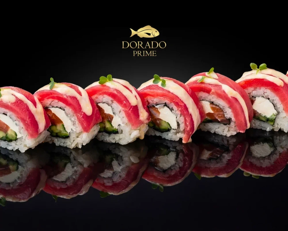 Внутри сочетание сливочного сыра и хрустящего огурца, дополненное деликатным лососем. Снаружи слайсы благородного тунца, дополненные ореховым соусом