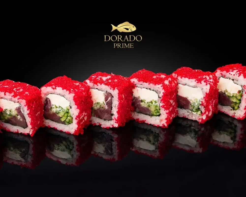 Яркое трио ингредиентов: насыщенный тунец, сливочный сыр и хрустящий огурец, снаружи сияет обсыпкой из икры масаго